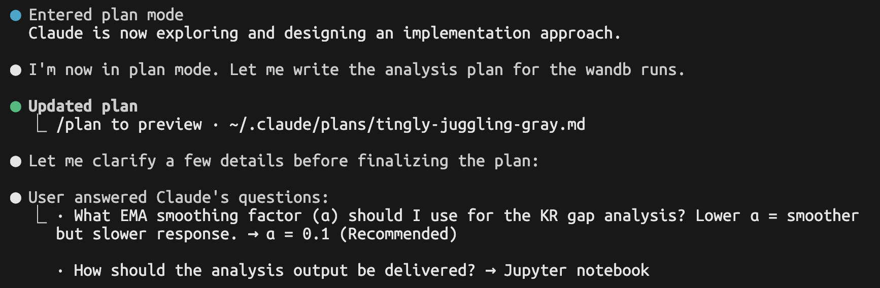 Writing all this analysis myself would easily take two hours. Now, I mostly read Claude’s analysis and spend my time thinking about the next step. Also, by driving the cost of “write code to analyze results” close to zero, my analysis actually became more rigorous. Obviously I can’t manually inspect hundreds of WandB runs. Instead of relying on one-off runs or intuition, I can ask Claude to analyze any small question that comes up in my mind, and get concrete results (visuals, significance tests, everything!) almost immediately.
